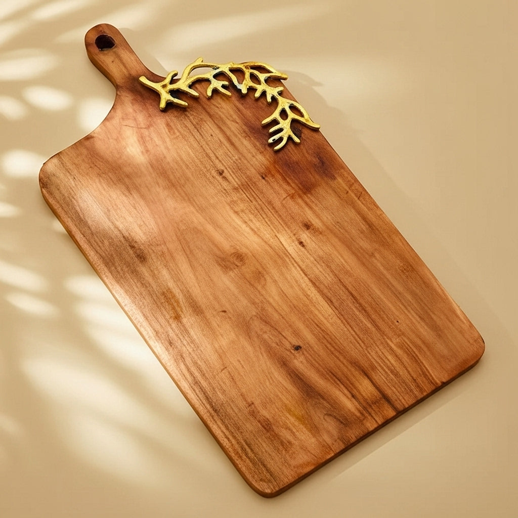 Description: Crafted from high-quality wood, this Rectangle board exudes warmth and rustic charm, adding a touch of organic beauty to any space. The wood's rich, natural grain provides a stunning backdrop for the intricate gold metal vine design that adorns its surface, creating a captivating contrast that catches the eye and captivates the senses. Whether used to present an array of artisanal cheeses, freshly baked bread, or decadent desserts, it elevates any culinary presentation with its innate beauty and sophistication.