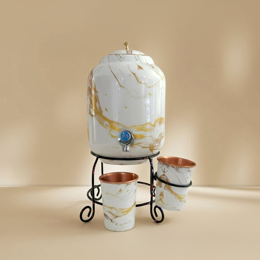Introducing the stunning copper dispenser design with a white and gold marble Meena print by Fanisha Home. This exquisite creation combines functionality and elegance to enhance your home decor while providing a convenient way to dispense water and keeping it always cool. The benefit is that storing water in a copper vessel creates a natural purification process and keeps water cool.