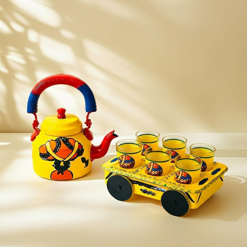 The hand-painted Indian aluminium kettle with glass cups on the designed wood cart tray for holding hot beverages is charming and practical kitchenware combining traditional craftsmanship and functionality.