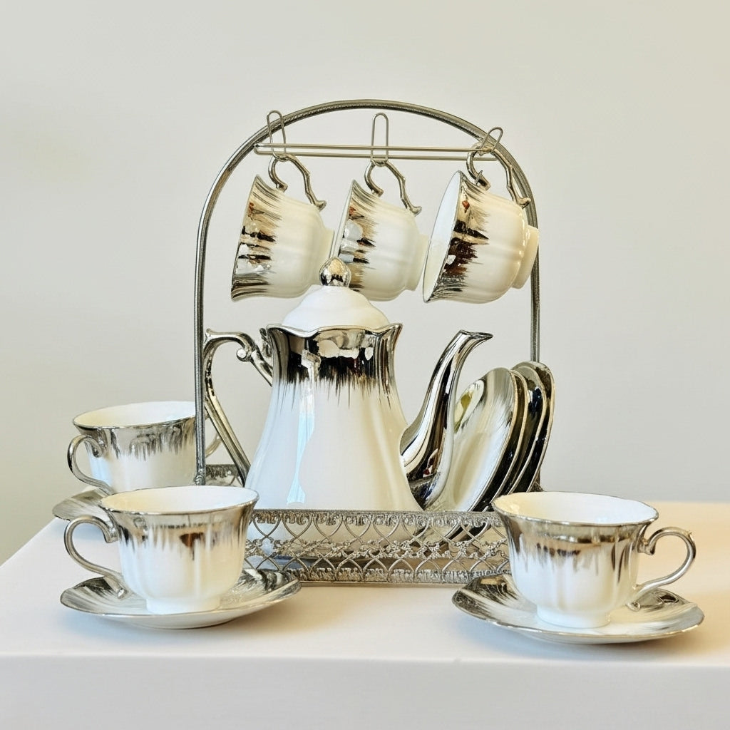 Elevate your tea experience with the exquisite luxury ceramic teapot by Fanisha Home. Crafted with meticulous attention to detail, this teapot exudes elegance and beauty in every curve and contour. Available in striking silver and opulent gold options, it adds a touch of sophistication to any setting. The teapot set includes a stunning storage solution that seamlessly holds the teapot, cups, and saucers. Unveil your collection with pride and transform teatime into an enchanting ritual. Let the luxury ceramic teapot by Fanisha Home be your companion in creating memories, savouring flavours, and cherishing the finer things in life.